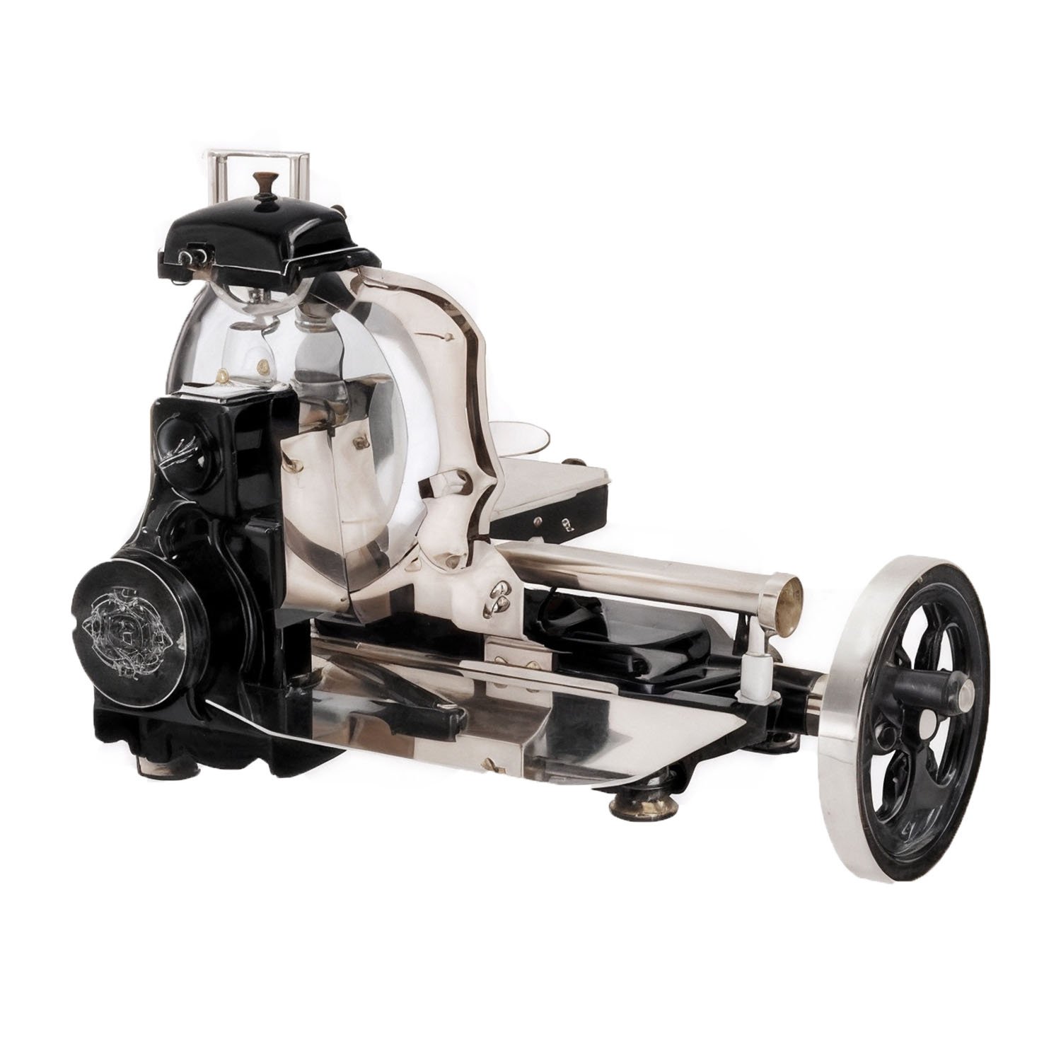 Ce modèle est une version revisitée de la célèbre Berkel modèle B, avec des finitions soignées, une construction en fonte et des détails en acier inoxydable. Chaque mouvement est fluide, chaque tranche est uniforme. Elle est idéale pour sublimer la présentation de jambons crus, charcuteries fines et autres produits haut de gamme.